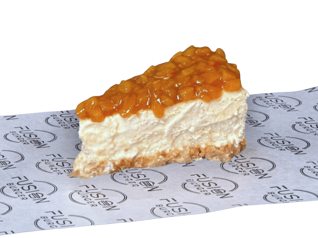 Tarta de queso de textura suave, con la base de galleta María. Coronada con nuestro vibrante chutney de mango.